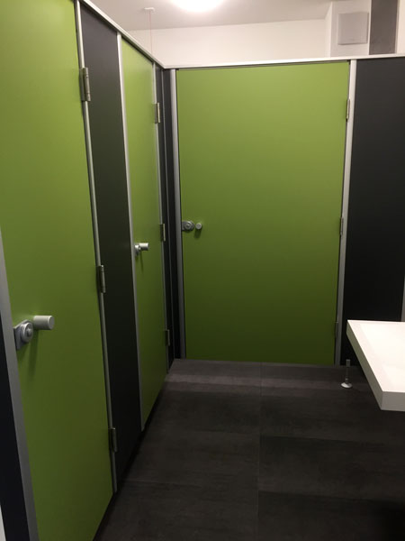 HPL-Vollkunststofftüren, 13 mm stark, in gleicher Bauweise wie die Wände. Türen stumpf einschlagend, zur Geräuschdämpfung ist eine Gummiprofildichtung in das Anschlagprofil eingezogen.